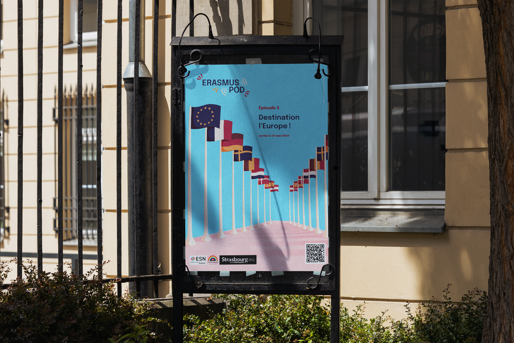 Série d'affiches illustrées réalisées à titre bénévole pour annoncer la sortie des 5 épisodes du Podcast ErasmusPod abordant différentes problématiques liées aux études à l’international créé par l’association ESN Strasbourg. Visuels également déclinés en miniatures pour les plateformes de streaming audio.