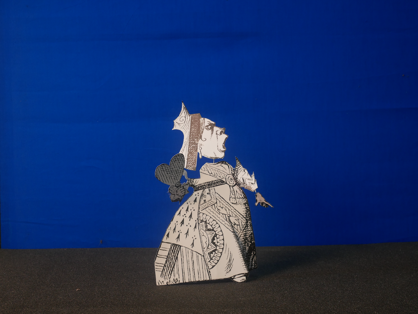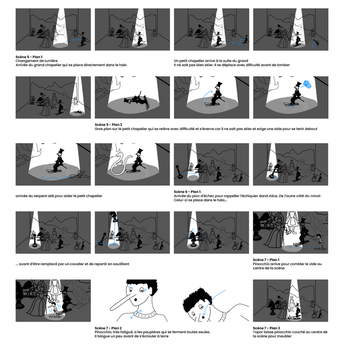 Le dialogue entre Topor et son assistante fictive est inspiré du tableau. En utilisant les illustrations de Tenniel, nous avons créé des marionnettes articulées avec du fil de fer et les avons animées en stop-motion. Le décor en volume ajoute de la profondeur et met en valeur les personnages. Les faisceaux de lumière ont été réalisés avec une lampe-torche, puis accentués dans After Effects.